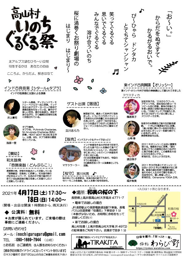 大きな桜の樹の下でのインド古典音楽、インド古典舞踊、落語、地元の皆様の太鼓などがあり、ほっこりとした素敵なイベントでした。