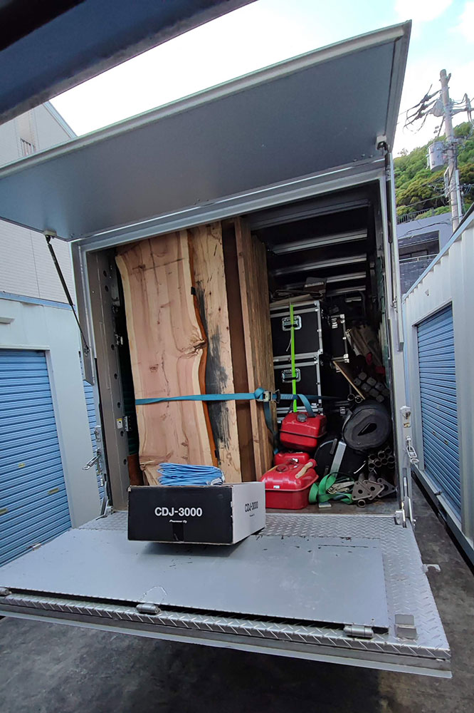出発前にぎゅうぎゅうに詰まったトラック。今回はステージ用の平台も9枚積んで出陣です!!