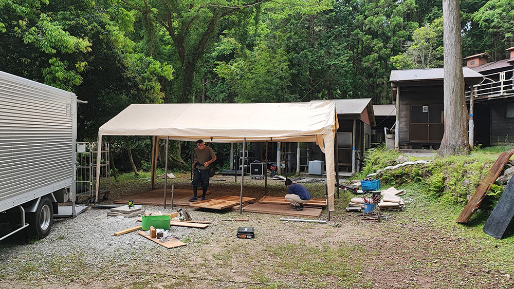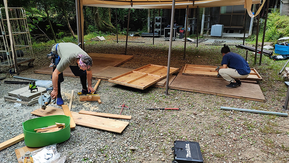 ステージはアーティストが飛んだり跳ねたりしても揺れず、当然平行でなければならず。2泊3日の野外フェスだけで使うステージといえども、家の床と同じくらいのクオリティを求められます。2022年の極楽温泉音楽祭では本職の大工さんが丁寧に施工してくれました。