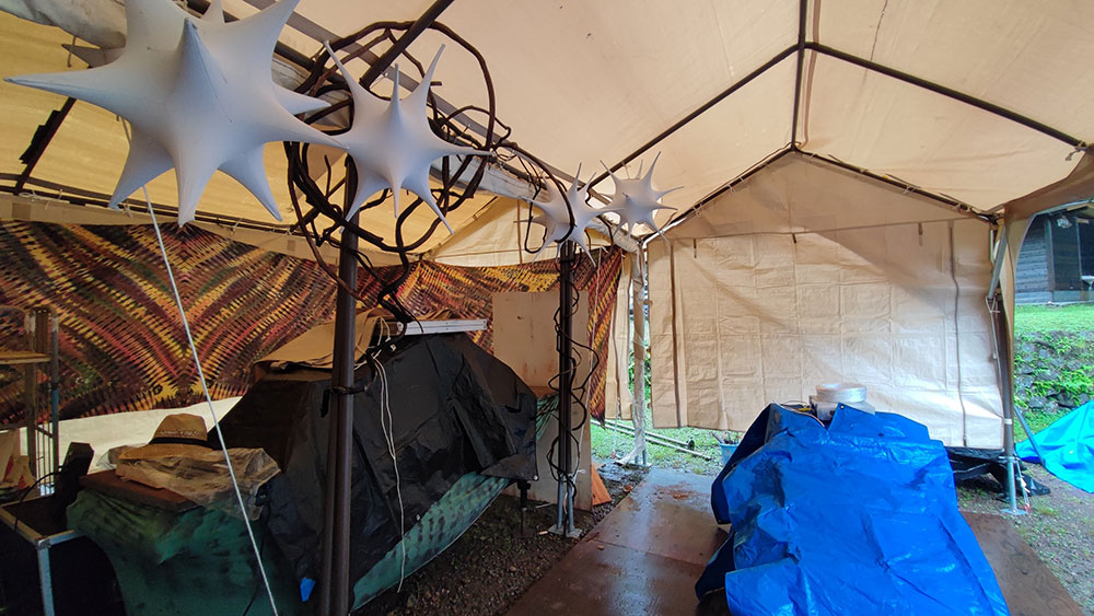 さてさて、この極楽温泉音楽祭ではGOOD SOUNDSチームはPAだけでなく、メインステージのテントも担当させていただきました。GOOD SOUNDチームは長年、野外フェスをやっているので、割と色々な機材を持っていたりします。