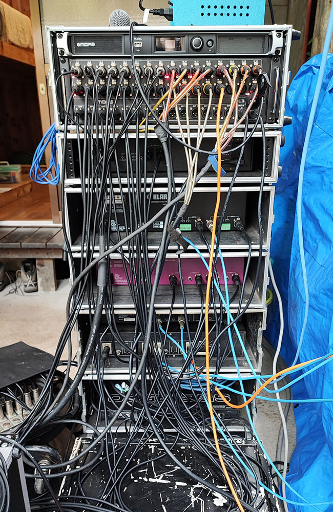 機材の後ろはケーブルだらけ…。PAって言うと、昔は全部こうだったんですよね。フルデジタルになって本当にトラブルフリーになりました。ありがたいことです。