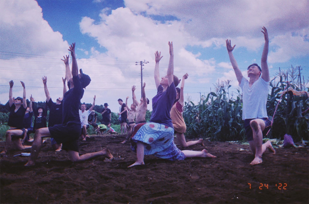 音響システムのすぐ横でヨガタイム。大地の恵みに感謝。泥に入る前の儀式にも感じる。